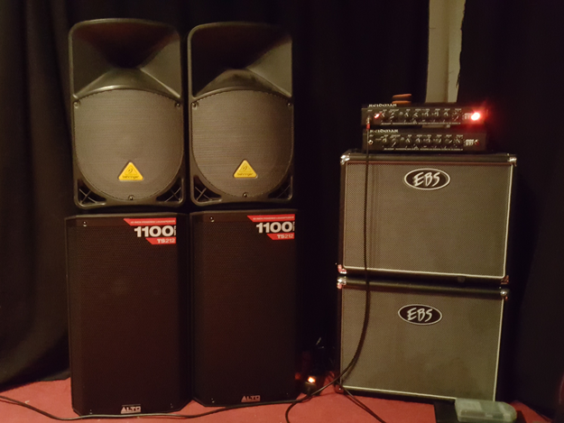 So now we have 4 Altos for the audience and we can probably manage a 300 head crowd now. And as monitors we use the Behringer B122D:s, so we can hear our selves in all that Alto noise. And it works really good.
